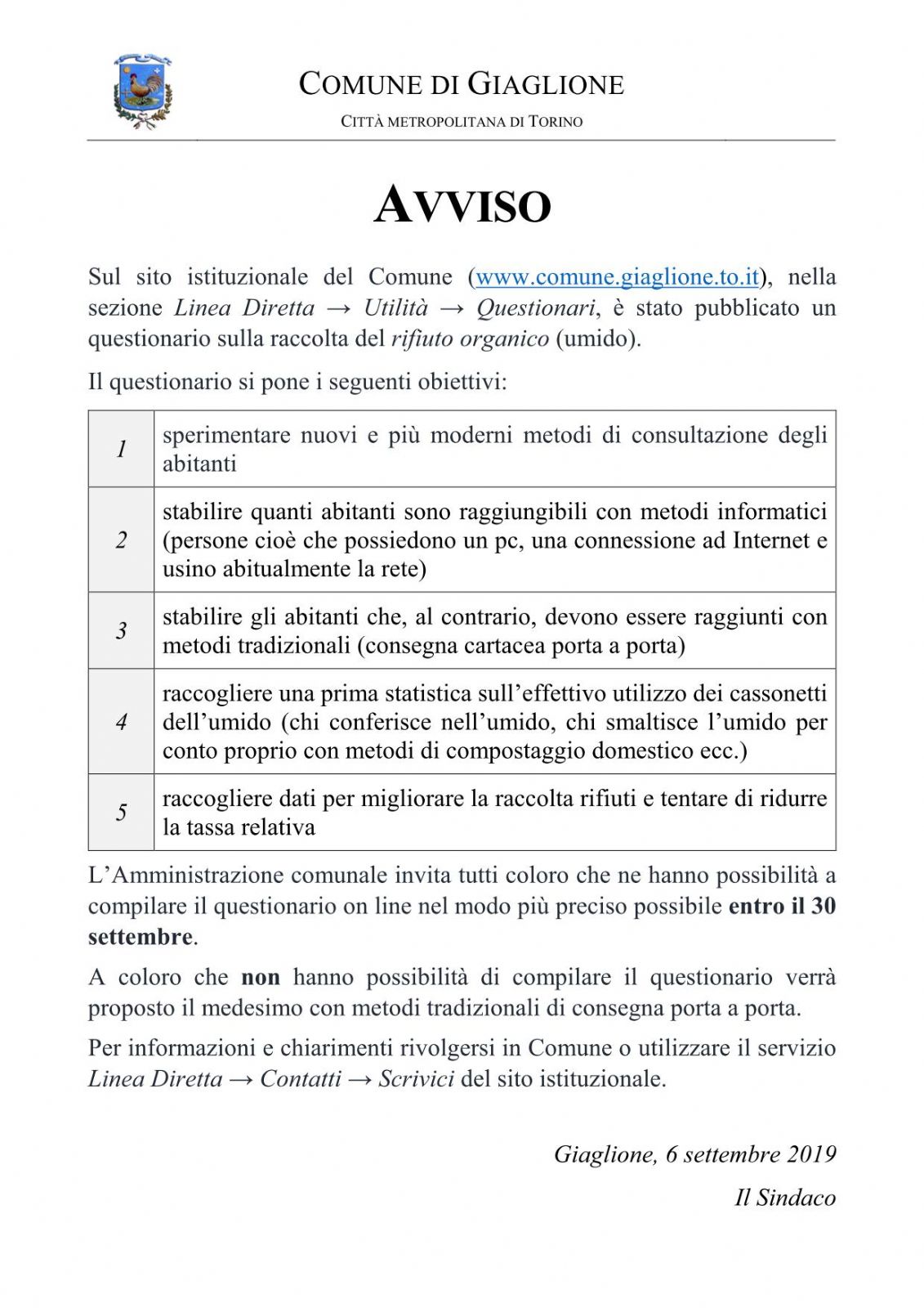 Sul sito istituzionale del Comune (www.comune.giaglione.to.it), nella sezione Linea Diretta > Utilità > Questionari, è stato pubblicato un questionario sulla raccolta del rifiuto organico (umido).
