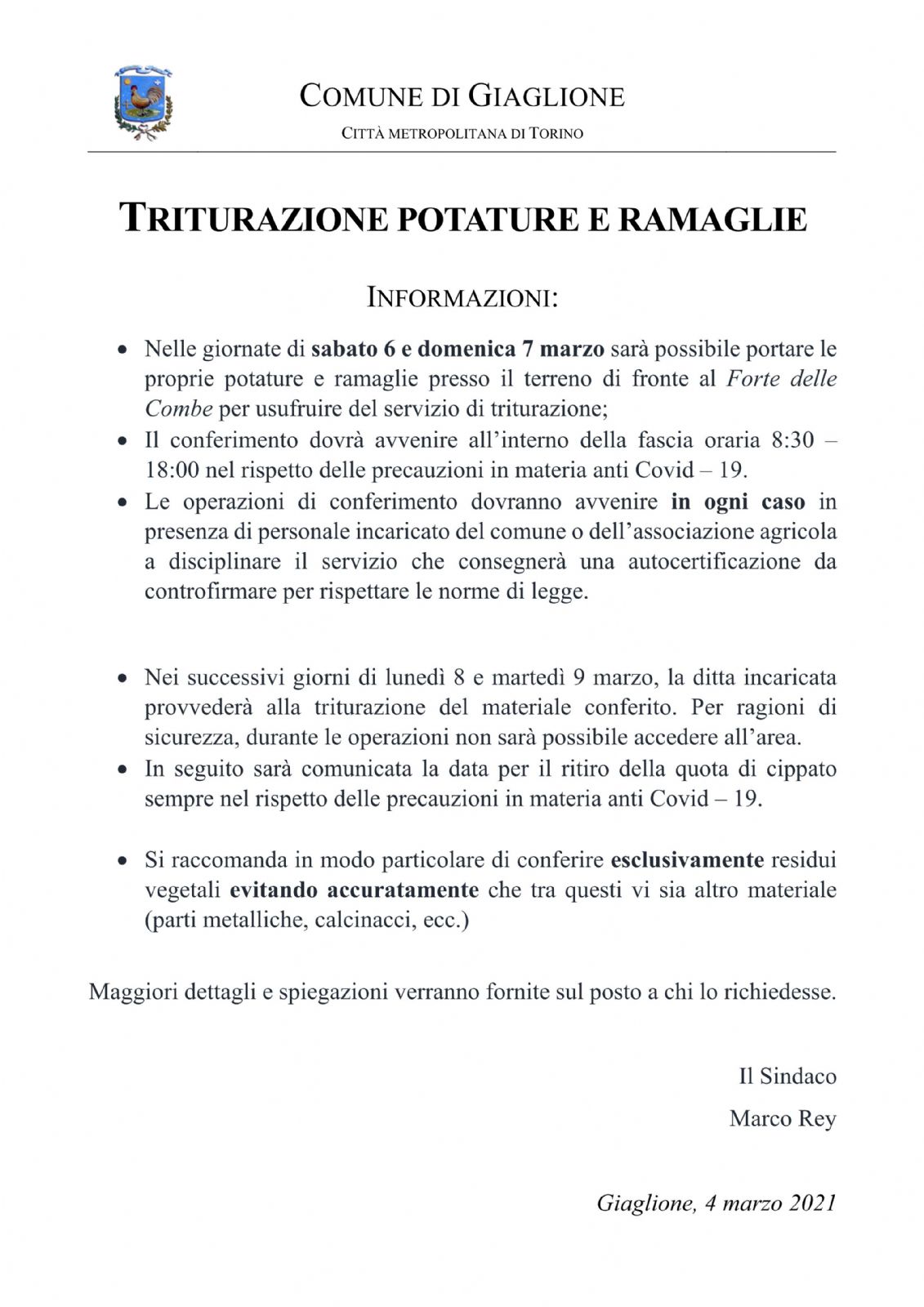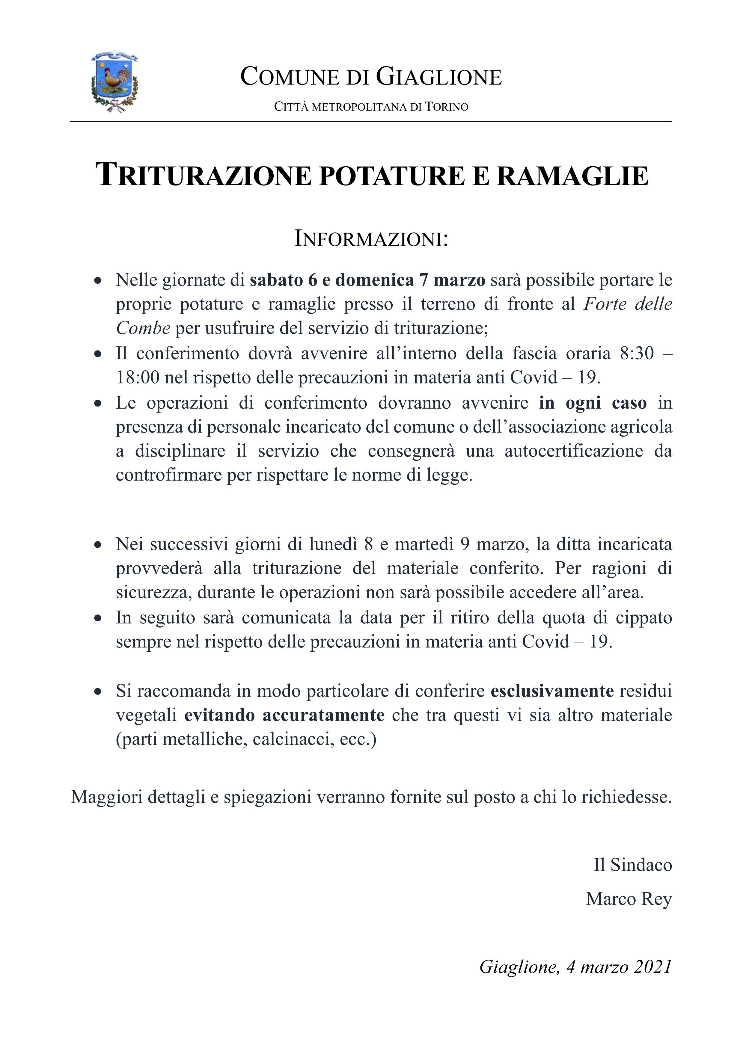 - Nelle giornate di sabato 6 e domenica 7 marzo sarà possibile portare le proprie potature e ramaglie presso il terreno di fronte al Forte delle Combe per usufruire del servizio di triturazione;