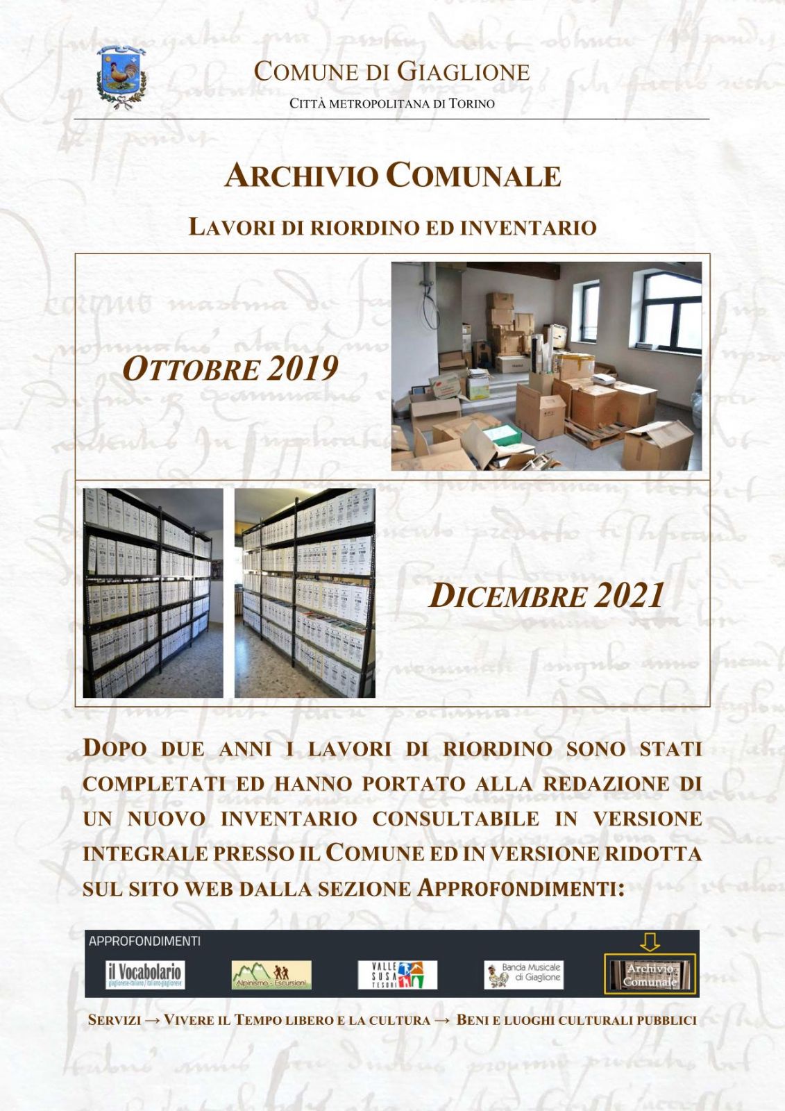 Dopo due anni i lavori di riordino sono stati completati ed hanno portato alla redazione di un nuovo inventario consultabile in versione integrale presso il Comune ed in versione ridotta sul sito web dalla sezione Approfondimenti o in alternativa seguendo il percorso Servizi → Vivere il Tempo libero e la cultura → Beni e luoghi culturali pubblici dal menù del sito istituzionale.