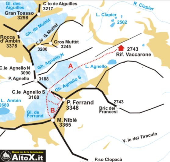 Discesa: dalla vetta scendere in breve per la cresta nord-est, fino al colletto nevoso m. 3295, quindi piegare a destra volgendo a nord fino a toccare il Glacier de Ferrand, quindi con un ampio semicerchio abbassarsi fino a guadagnare il Colle Superiore del Agnello, da cui per l'itinerario di salita.